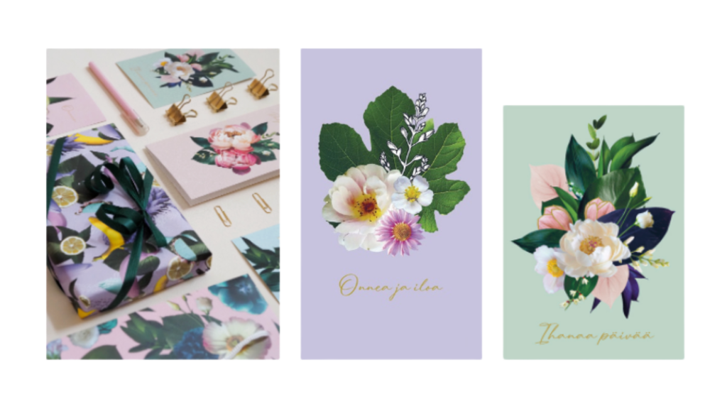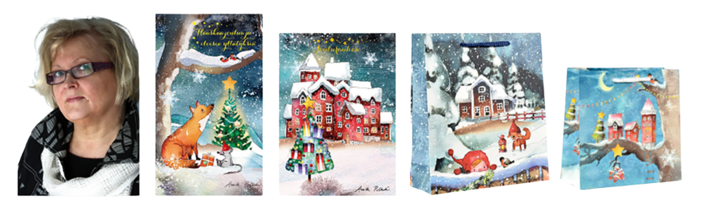 Kuvantekeminen on ollut minulle lapsesta saakka rakas ja tärkeä ilmaisumuoto. Korttisuunnittelu sai alkunsa lukiolaisena värikynillä piirtämistäni tonttukorteista. Vuosia myöhemmin löysin itseni uudelleen korttien parista graafisena suunnittelijana, ja edelleen jouluaiheiset tuotteet ovat minulle mieluisimpia toteuttaa, olipa kyse kortista, lahjakassista, adventtikalenterista, rasiasta tai tarra-arkista. Suunnittelen paljon myös erilaisia kuoseja ja käytän niitä sopivissa kohdissa elävöittämään piirroskuvitusta.