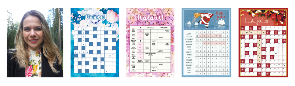 Vuodesta 2011 olen toiminut yrittäjänä ja päätyökseni laadin ristikoita moniin eri ristikkolehtiin. Tavallisten kuvaristikoiden lisäksi laadin monipuolisesti erilaisia erikoistehtäviä. Ristikot ovat hyvin suosittuja ja monien ratkojien rakas harrastus. Minusta on ihanaa tarjota ratkojille ilon ja onnistumisen hetkiä ristikoiden parissa. Ristikkotöiden lisäksi teen graafisen alan töitä, kuten kuosisuunnittelua ja lehtitaittoa.